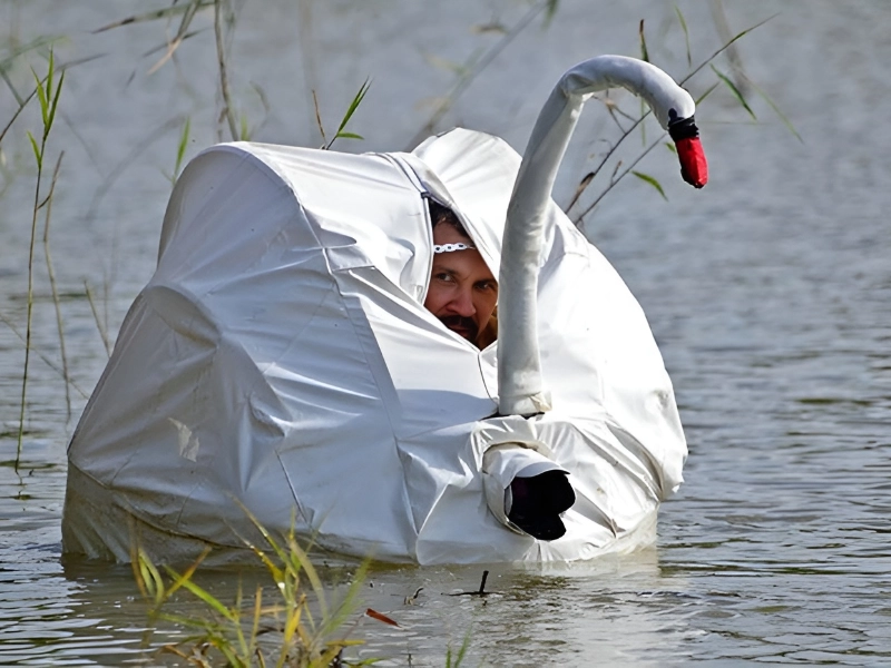 Let us hope the swan does not fall in love with him. Clad in white and drifting serenely, the subject could pass for one of the elegant birds. This whimsical moment softens the line between human and animal, offering gentle humor and poetic charm.