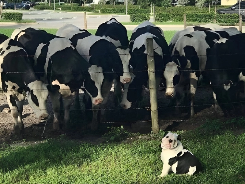The cows likely took him for one of their own. Dressed to echo the herd, the subject blends into the group, blurring human and animal for a playful, heartwarming scene.