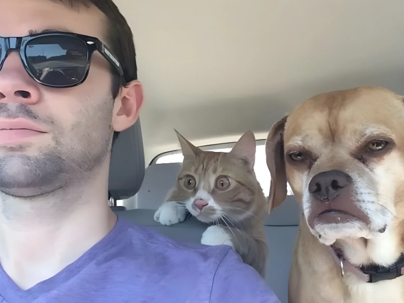 可能性のあるカメラ: Google Pixel 購入場所: Best Buy、Google Stores。 価格: 400–1,200ドル* この写真には「さあ、乗ろう」というキャプションが付けられており、叙事詩的な冒険の始まりのように見えます。犬は集中し、猫は不安そうに見え、一緒になって彼らはハリウッドのロードトリップ映画に値するシーンを作り出しています。
