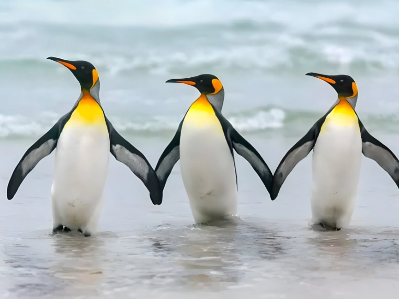 この甘い画像は、ビーチに沿って歩き、お互いの翼を握り合う3羽のキングペンギンを示しています。それは動物と人間の関係の類似性を強調し、2023年コメディ野生生物コレクションに選ばれました。