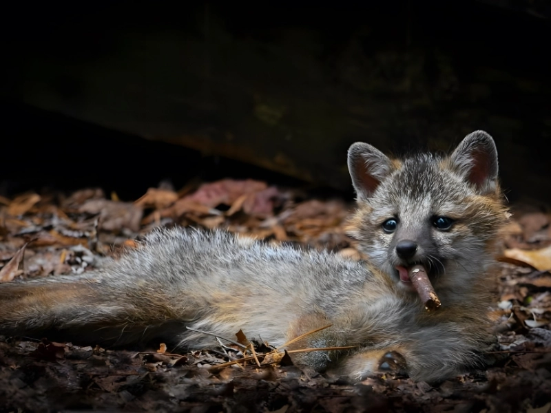 2023年コメディ野生生物コレクションからのこの面白い写真は、くつろぎながら自家製の葉巻を吸っているように見える若い子狐を示しています。