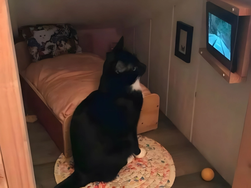 この愛らしい猫は、階段下にハリー・ポッターの部屋のような、しかしはるかに豪華な私設スポットを持っています。エリアには丸いラグ、遊び心のあるボール、小さな写真立て、そして猫をテーマにしたマッチングクッションが付いた居心地の良いベッドがあります。見どころは?テレビです!