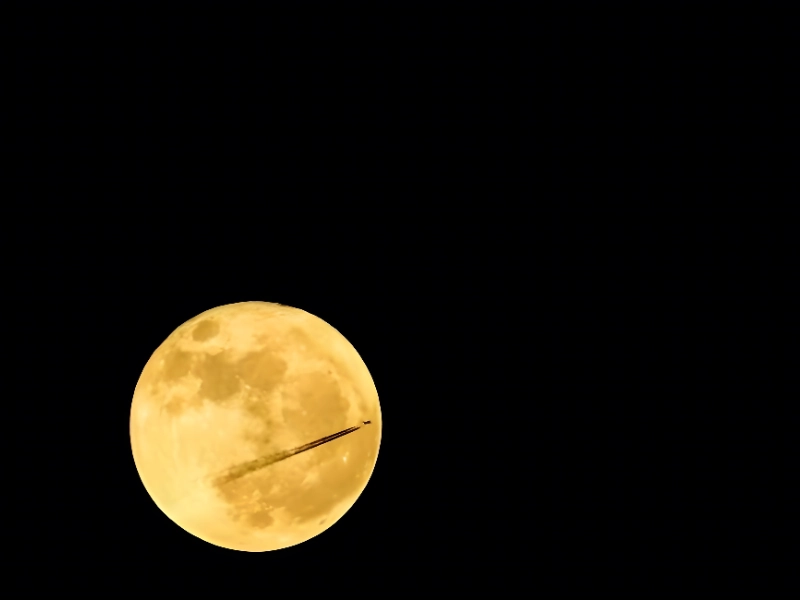 月が空を支配する中、飛行機からのはかない軌跡はその輝きを高めています。この魔法のような光景は、閲覧者に輝く月を背景に夜を飛ぶ魔女の夢を見るように誘います。
