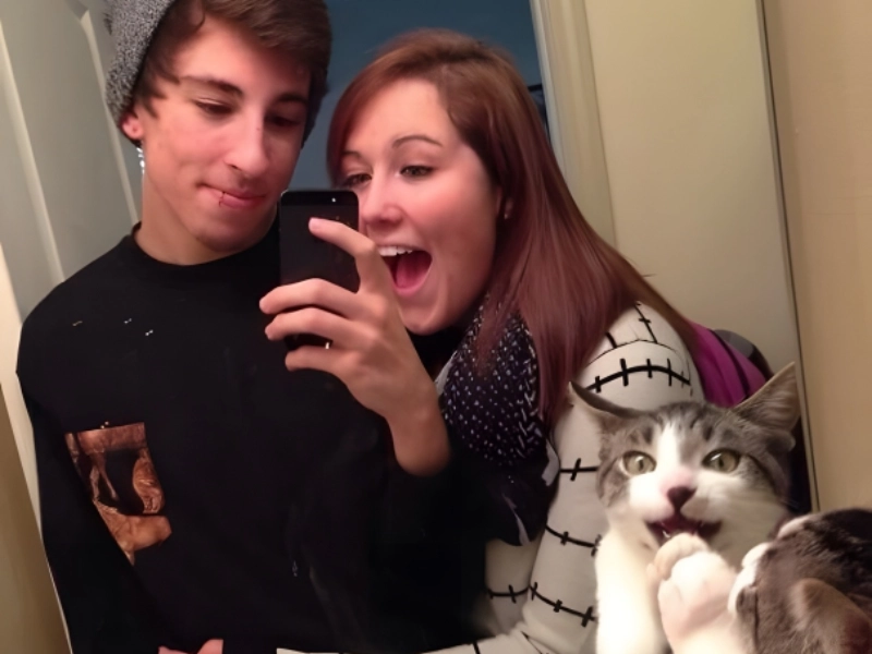 ペットは愛らしく、この自撮りがそれを証明しています。特に猫は飼い主の真似をして楽しみに参加するのが大好きです。このカップルは甘い瞬間を捉えようとし、彼らの猫は彼らのジェスチャーを真似します。もしかしたら猫はただ参加したかったか、彼らが一緒にいるのを見て幸せなのかもしれません。