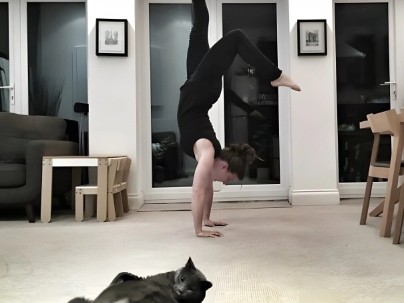 この猫は下向きのポーズをしています!飼い主がヨガをしている間、猫は自分自身の動きを披露しています。人間は猫を恥ずかしがらせているかもしれません、ヨガをしたことがないように見えます。それでも、試みることが最も重要です。怠惰な猫でも練習で改善できます。