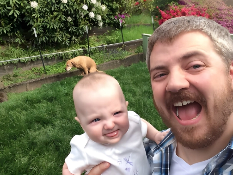 犬が赤ちゃんの頭の上でうんちをしているように見える写真を見たことはありますか?それは平和な庭のシーンと衝突しますが、それでも可笑しいです。通常、うんちをする犬は写真を改善しませんが、ここでは小さな犬が赤ちゃんの頭の上に座っているように見えます。それは家族のアルバム用の一枚です。