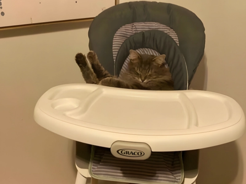 典型的な誤認!新しいベビー用品が届くと、この猫はそれらがすべて自分の楽しみのための贈り物であると確信しています。ハイチェアから柔らかいベビー毛布まで、すべてが新しい遊び場または休息場所になります。結局のところ、猫の心の中では、世界は彼らとその気まぐれを中心に回っています。